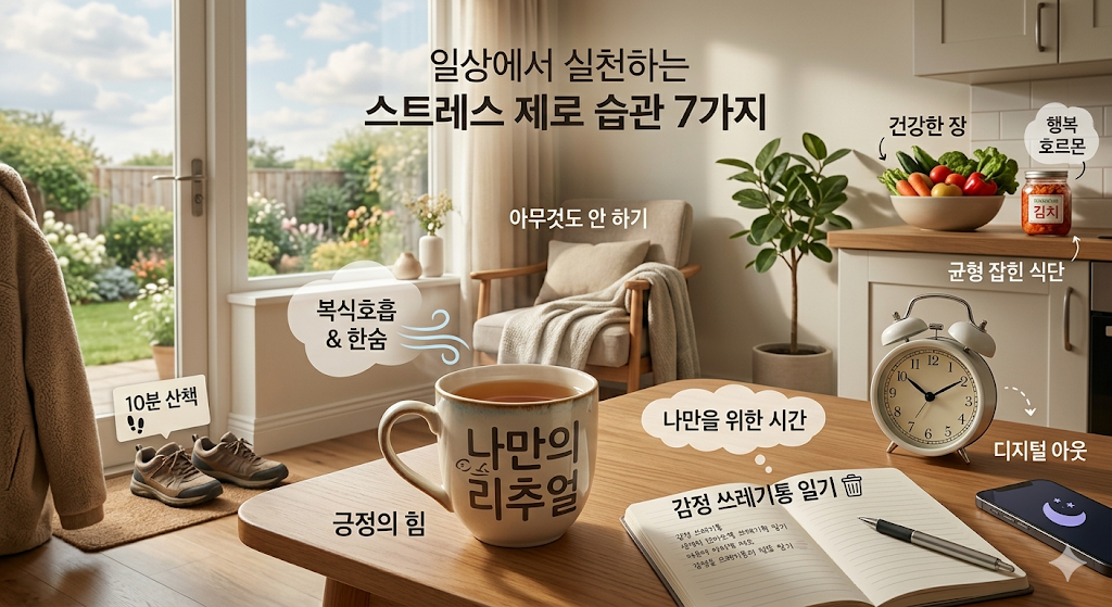반복되는 일상 속에서 스트레스는 마치 불청객처럼 우리를 찾아오곤 해요. 피하고 싶지만 피할 수 없다면, 스트레스가 우리 몸과 마음을 장악하기 전에 효과적으로 관리하는 기술이 필요하답니다. 오늘은 거창한 계획이 아닌, 누구나 지금 당장 시작할 수 있는 가장 현실적이고 강력한 스트레스 관리 습관 7가지를 소개해 드릴게요. 이 작은 습관들이 모여 여러분의 삶에 얼마나 큰 평온함을 가져다주는지 직접 경험해 보세요.🕒 1. 5분의 기적, '아무것도 안 하기' 시간우리는 깨어 있는 내내 무언가에 집중하고 정보를 소비하는 데 익숙해져 있어요. 뇌에 쉴 틈을 주지 않는 것이 스트레스의 가장 큰 원인 중 하나예요.뇌의 일시정지 버튼: 하루에 딱 세 번, 5분씩만 모든 기기를 내려놓고 멍하니 있어 보세요. 창밖을 보거나..