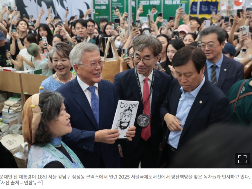 오늘 도서전의 가장 뜨거운 뉴스 중 하나는 바로 문재인 전 대통령의 방문 소식이었어요! 평소 책을 사랑하고 퇴임 후에는 '평산책방'이라는 작은 서점을 운영하고 계신 문 전 대통령이 개막 첫날 도서전 현장을 찾아 자신의 책방 부스를 둘러보고 방문객들과 따뜻한 인사를 나누셨다고 합니다.